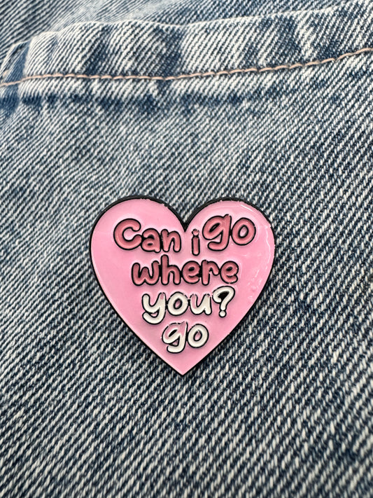 Pink heart 'can I go where you go?' enamel pin