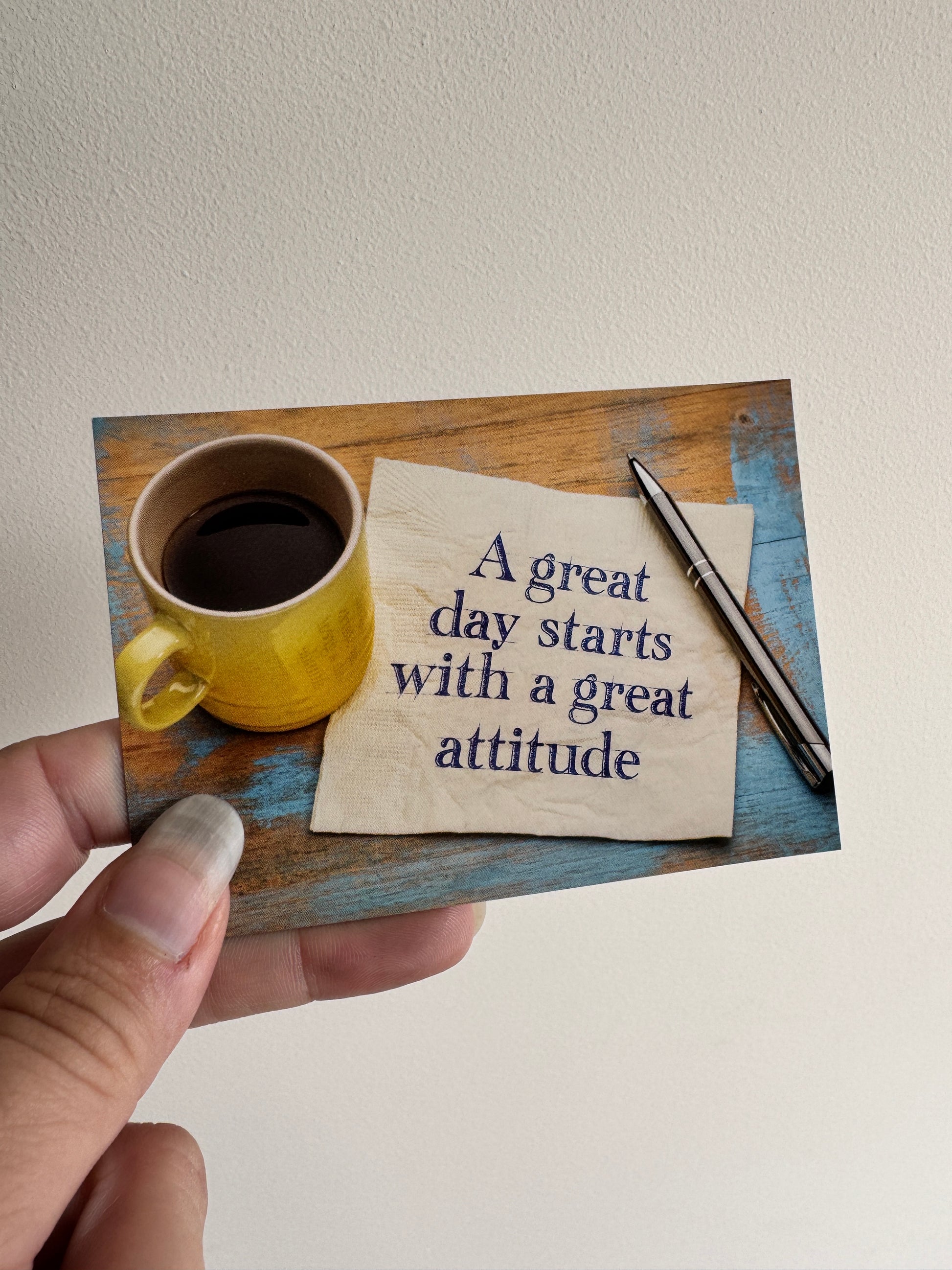 'A great day starts with a great attitude' coffee cup background magnet. Display magnet designed to stick on fridges, filing cabinets, sheds, and more.