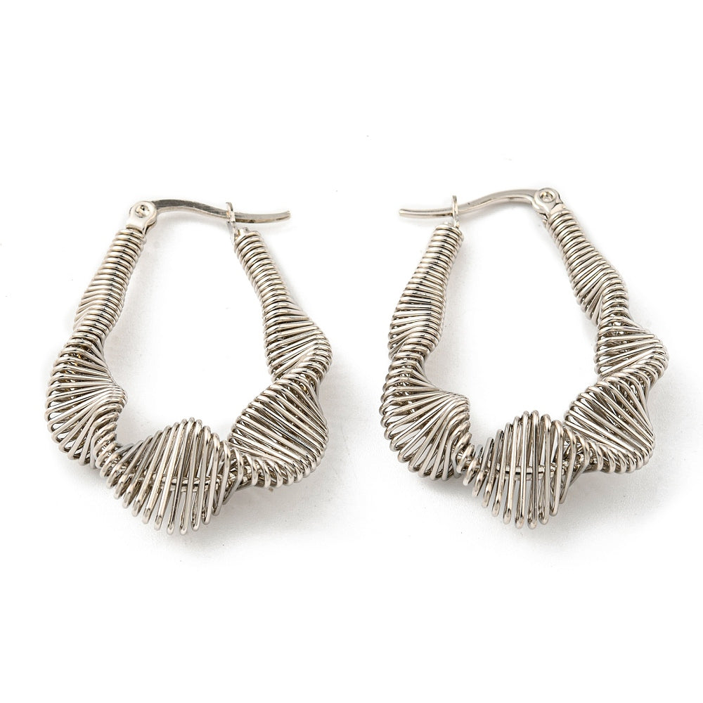 "Stainless steel teardrop shaped hoops with a twisted wire wrapped detail. A great length of 3.4cm for either day or night.