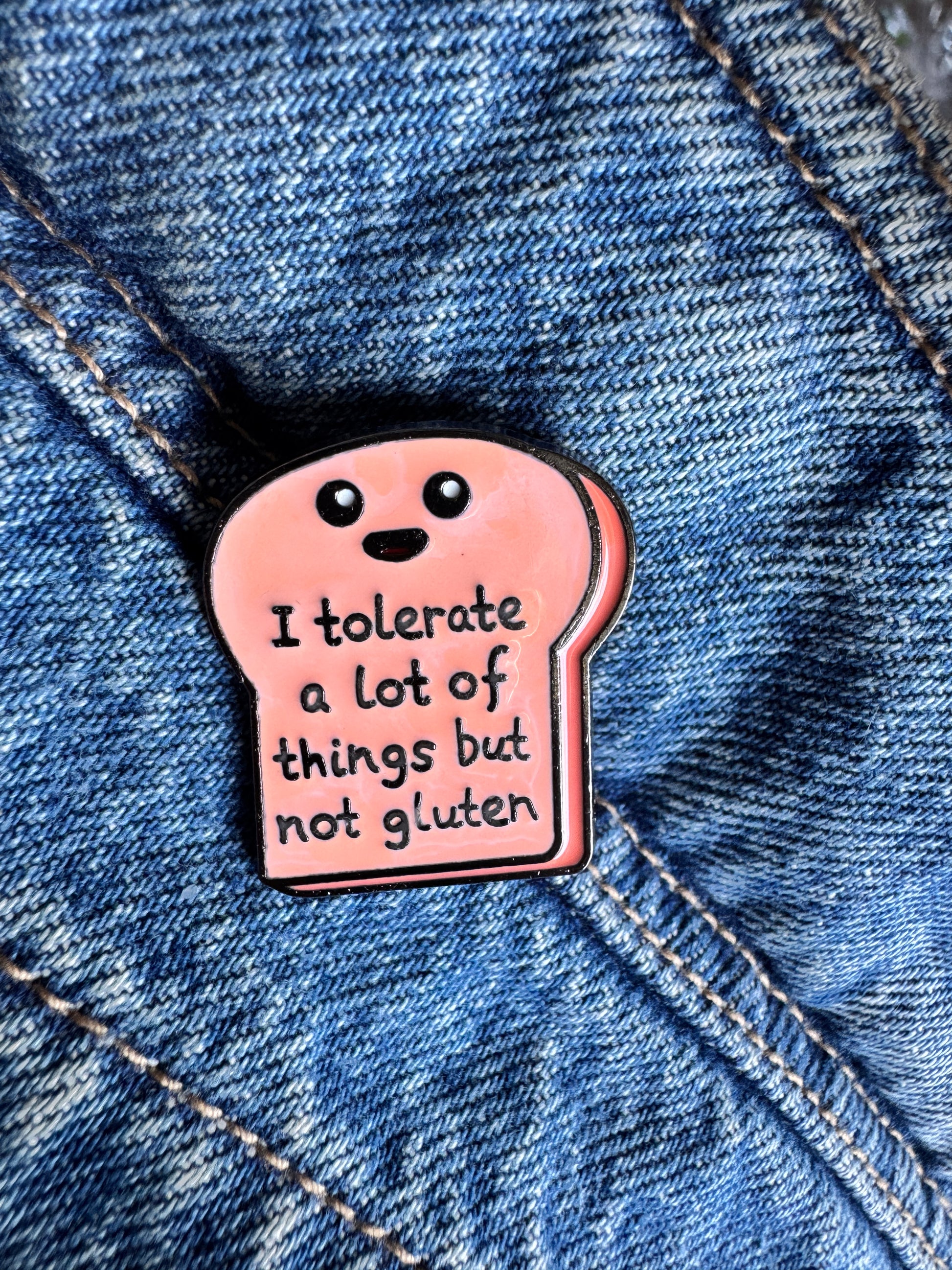 'I tolerate a lot of things but not gluten' pin brooch for backpacks, clothes, hats etc.