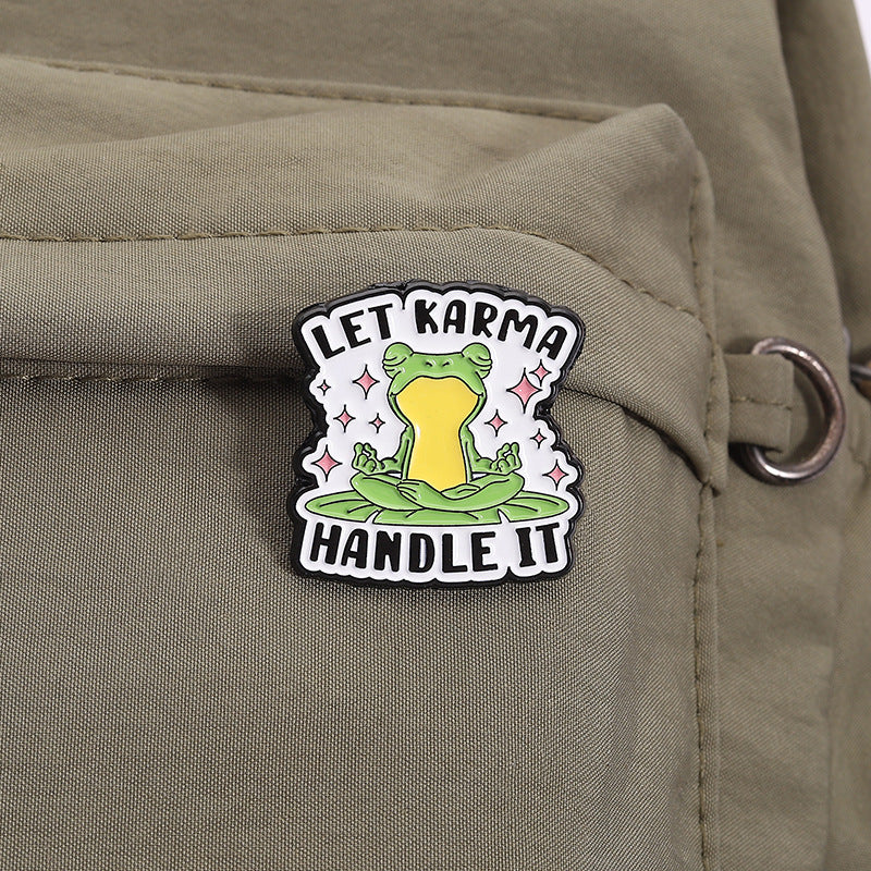 Frog meditating with words 'let karma handle it' hat pin brooch for backpacks, clothes, hats etc.