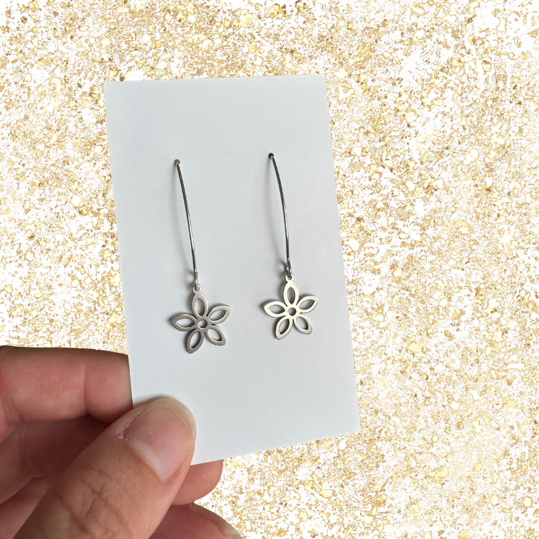 Stainless steel flower charm dangling off a french style drop. With a length of approx. 40mm.